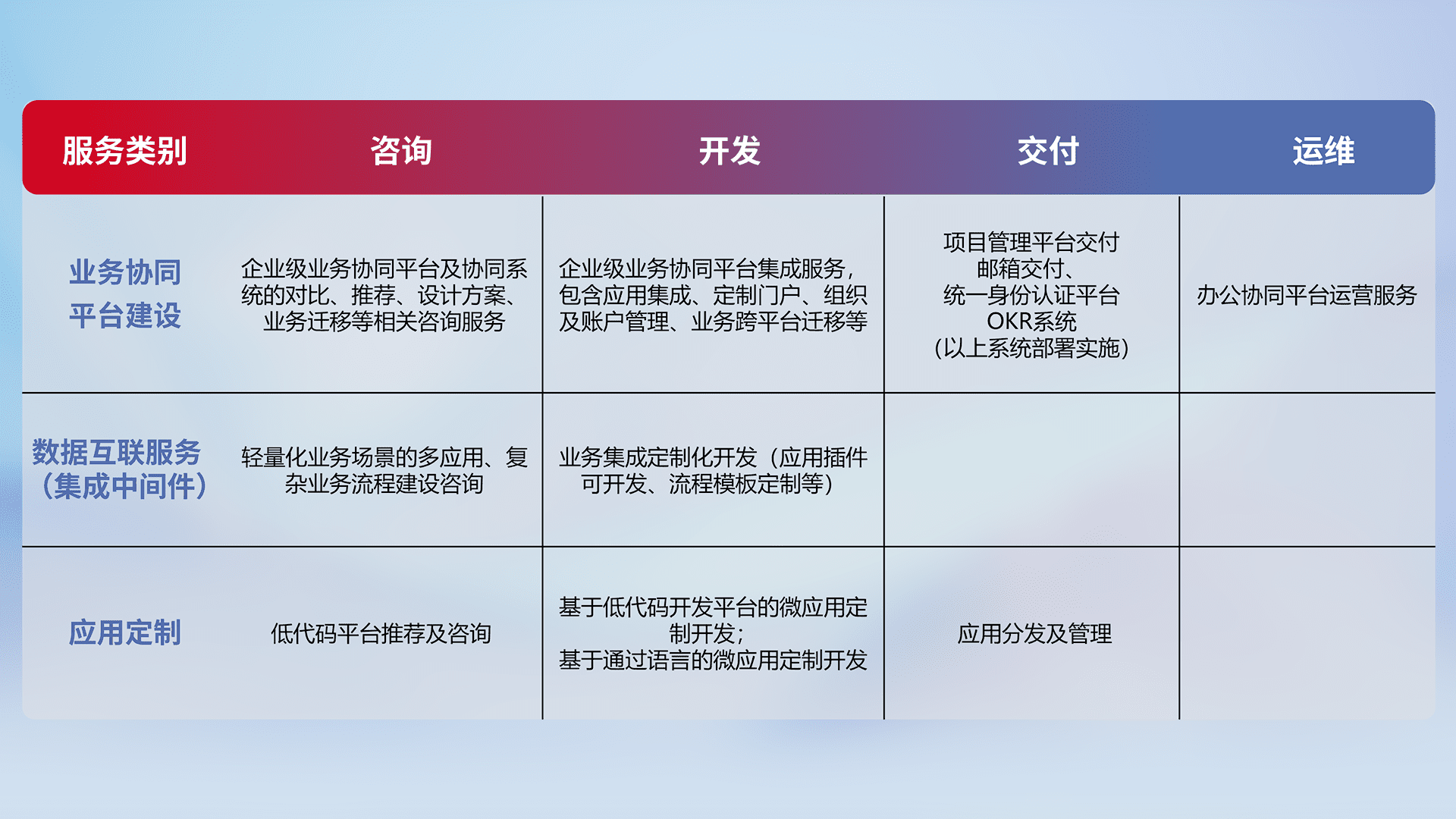 针对钉钉、、、、企微、、、、IDaas等平台级产品提供产品的规划、、方案、、交付、、、定制化开发等服务,,,实现如统一协同办公、、、、智能客户服务、、、混合会议管理、、、智能数据查询、、等业务场景,,实现数字化转型。。。